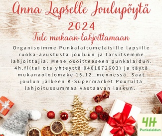 | ANNA LAPSELLE JOULUPÖYTÄ 2024 lomake.docx (26 kB) Täytä lomake ja toimita se 15.12.2024 mennessä osoitteeseen punkalaidun@4h.fi |